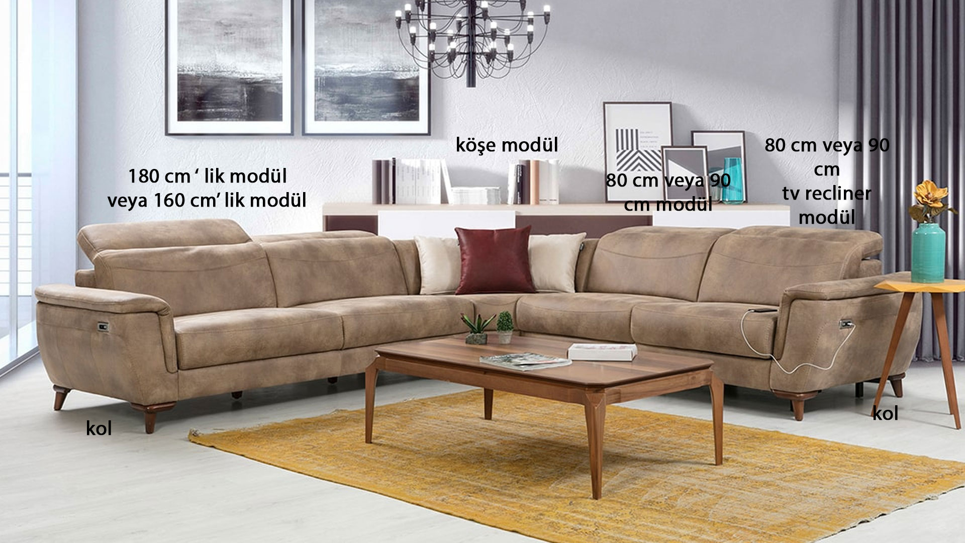 | Ek Bilgiler | Kumaş renk seçenekleri mevcuttur.Köşe takımımızı odanızın ölçüsüne göre istediğiniz modüllerden oluşturabilirsiniz. |