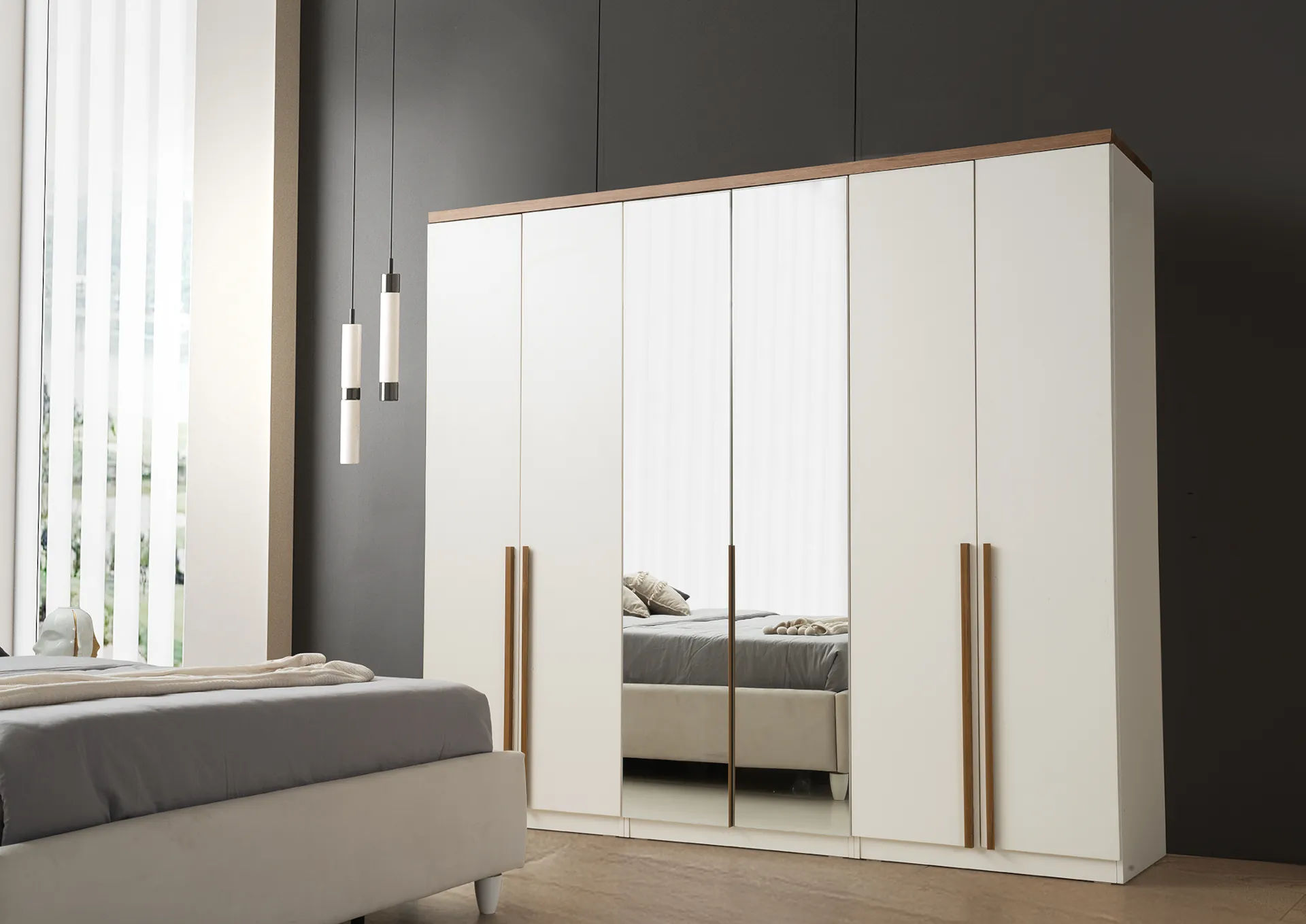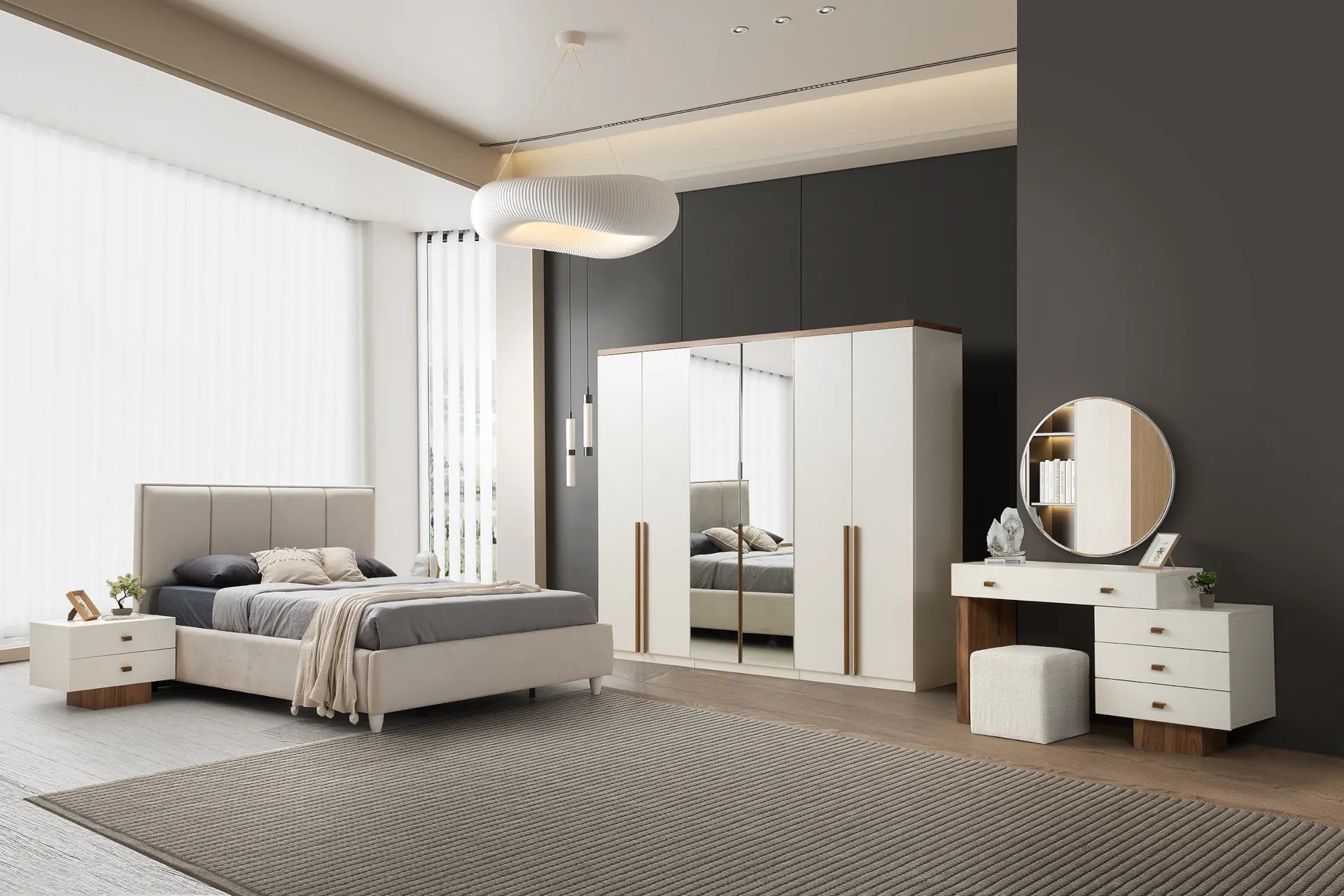 | Takım İçeriği - | 6 Kapılı Gardırop (3 adet 2 Kapılı Dolap) + Bazalı Karyola + Şifonyer ve Aynası + 2 adet Komodin |