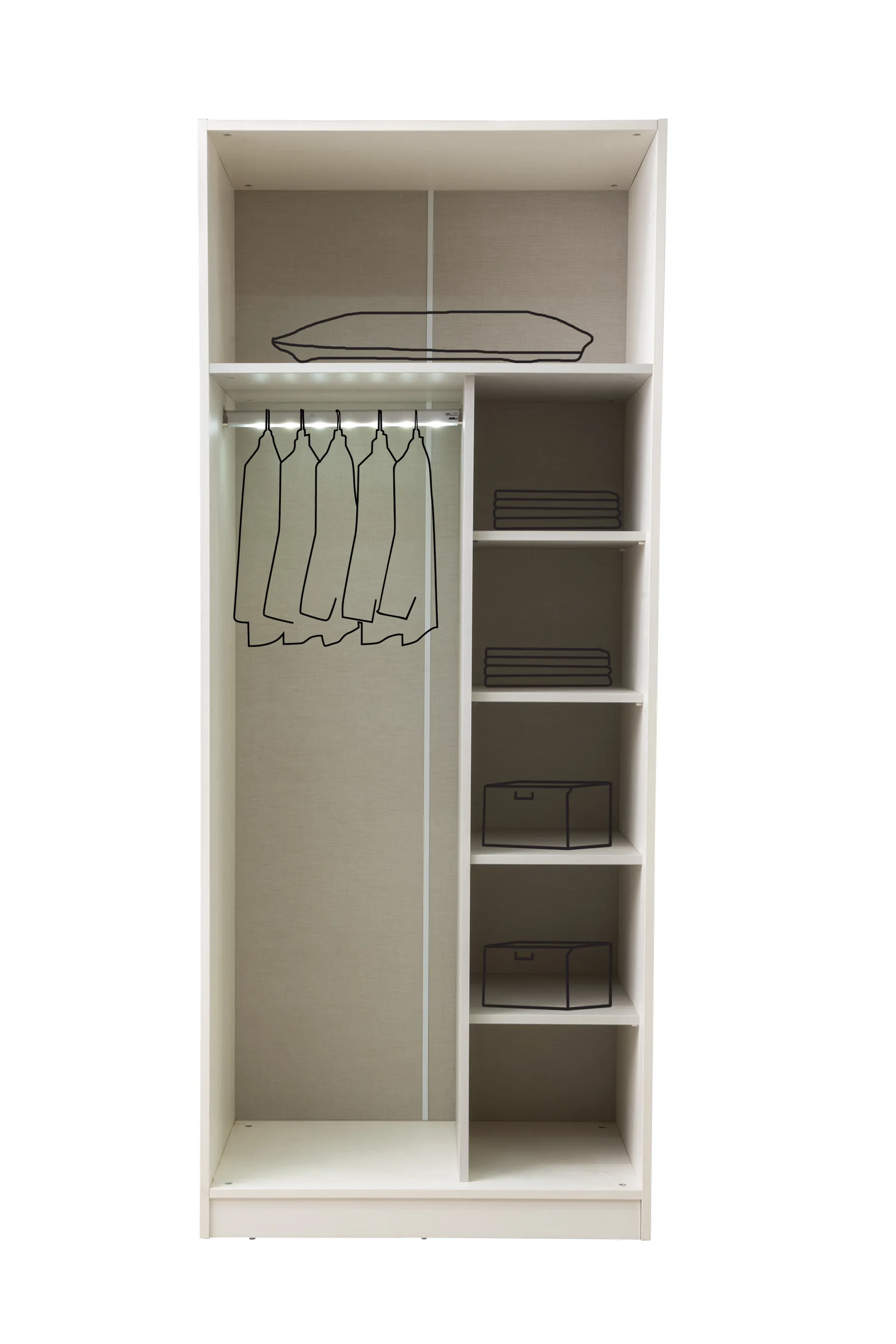 | Dolap İçeriği | Askılı, raflı ve çekmeceli. |